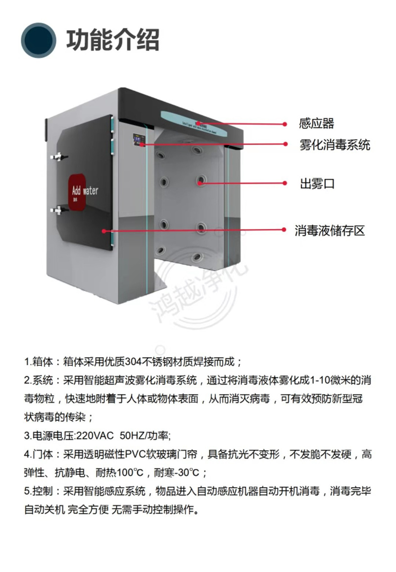 2. 系統(tǒng):采用智能超聲波霧化消毒系統(tǒng),通過(guò)將消毒液體霧化成1-10微米的消毒物粒,快速地附著于人體或物體表面,從而消滅病毒,可有效預(yù)防新型冠狀病毒的傳染;