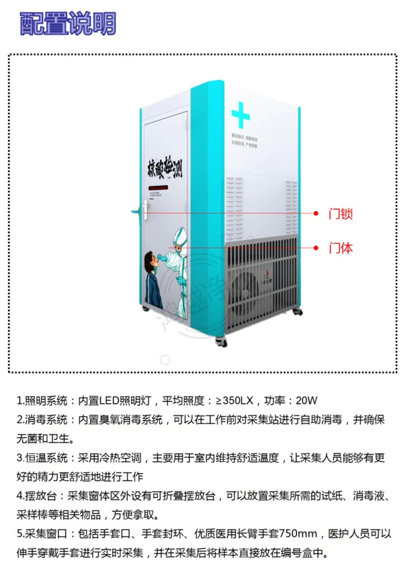 1.消毒系統:內置臭氧消毒系統,可以在工作前對采集站進行自助消毒,并確保無菌和衛生;